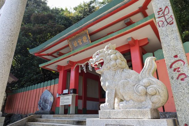 As cores e o estilo do portão, que chamam a atenção de longe, são inspirados no Ryugu-jo – palácio subaquático mitológico que seria a morada do deus dragão do mar. Isso porque registros históricos indicam que Antoku morreu no colo de sua avó Nii-no-Ama, que teria pulado no mar após afirmar que ambos iriam para um palácio submarino. O calendário do santuário – que foi fundado em 1191 – possui eventos durante todo o ano. O principal deles, o festival Sentei, é celebrado todos os anos no dia 3 de maio. Muitas tradições e ritos religiosos e culturais são preservados ao longo de vários séculos. O local fica iluminado durante a noite.